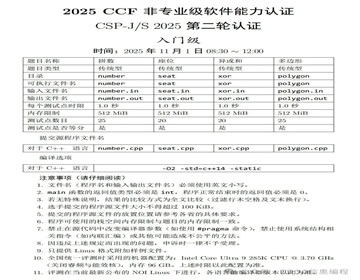 2025 CCF 非专业级软件能力认证 CSP-J/S 第二轮认证11月1日进行,目前真题曝光。我们对CSP-J真题进行了分析解读,并拟定标程,供大家参考,一起来看下。拼数(number)题意给定一个包含小写字母和数字的字符串 s ,要求从小写字母及数字的字符串 s 中选出任意多个数字 ,并按任意顺序将它们拼接成一个正整数。每个数字只能使用一次。求出所有能拼成的正整数中的最大值。1≤∣s∣≤106 解析把所有的数字找出来,放在桶里面倒序输出,或者倒序排个序输出都可以。标程座位(seat)题意考场共有 n 行 m 列座位,共 n×m 名考生。考生按照成绩由高到低,以“蛇形”顺序分配座位。蛇形分配的规则是:先从第1列第1行向下到第 𝑛n 行,然后转向第2列第 n 行向上到第1行,再转向第3列第1行向下到第 n 行,以此类推。给定考场的行数 n、列数 m 和所有考生的成绩 a1,a2,⋯,an×m (其中 a1 是小R的成绩),要求确定小R的座位所在的列数 c 和行数r。解析把数据排个序,找到a[1]所在的位次,然后将位次-1分别对行数相除和求余,除出来的就是列数,求余出来的就是行数,不过行数要根据列数的奇偶性正序或者倒序。标程异或和(xor)题意给定一个长度为 n 的非负整数序列a1,a2,⋯,an 和一个非负整数 k。定义一个区间[l,r] 的权值为该区间内所有元素的二进制按位异或和。目标是选择序列中尽可能多的不相交的区间,使得每个区间的权值都等于 k。1≤n≤5×105 0≤k, ai<220解析贪心,对于每个i来说,只要能够找到前面某一个数,使得这段区间异或和是k那么就肯定选,不然往后拖的话不会让答案更优。于是先求出前缀异或和s,对于每个s[i], 看能不能找到上一个出现的s[i]的位置last,可以就说明last+1到i构成了一个区间,维护最后一次的右端点right,只要last>=right就说明形成一个新区间,线性扫一遍就可以了,O(n)标程解法一多边形(polygon)题意有 n 根小木棍,长度分别为a1,a2,⋯,an。从这 n 根木棍中选出 m 根 (m≥3),它们能拼成一个多边形当且仅当所有选出木棍的长度之和大于最长木棍长度的两倍。 要求计算出有多少种选择小木棍的方案,使得选出的小木棍能够拼成一个多边形,答案对 998244353取模。3≤n,ai≤5000解析简单的01背包,先背包求出F[i][j]表示前i个数能够凑成和为j的方案数,那么对于每个数a[i],所有的F[i-1][0-a[i]]都是不合法的方案,把所有这样的方案累加,最后再用2n 1减去不合法方案即可。标程