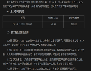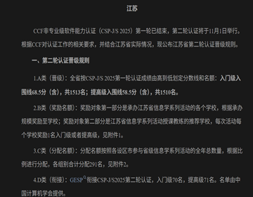 江苏CCF非专业级软件能力认证(CSP-J/S 2025)第一轮已结束,第二轮认证将于11月1日举行。根据CCF对认证工作的相关要求,并结合江苏省实际情况,现公布江苏省第二轮认证晋级规则。 一、第二轮认证晋级规则1.A类(晋级):全省按CSP-J/S 2025第一轮认证成绩由高到低划定分数线和名额:入门级入围线68.5分(含),共1513名;提高级入围线58.5分(含),共1510名。2.B类(奖励名额):奖励对象第一部分是承办江苏省信息学系列活动的各个学校,根据承办规模奖励至学校;奖励对象第二部分是江苏省信息学系列活动授课教练的推荐学校,每次活动每个学校奖励1名入门级或者提高级,见附件1。3.C类(分配名额):分配名额按照各设区市参与省级信息学系列活动的全年总数量,根据比例进行分配,各组别合计分配291名,见附件2。4.D类(衔接):GESP衔接CSP-J/S2025第二轮认证,入门级70名,提高级71名。名单由中国计算机学会提供。请各设区市CSP-J/S认证组织单位统计B类和C类确定推荐人员(J组不得低于26分,S组不得低于24分),于10月10日9:00前在本市公示无异议后,将名单发送至邮箱JSOI@163.com ,并通知晋级选手关注NOI官网第二轮认证相关通知。 二、第二轮认证时间时间08:30-12:0014:30-18:302025年11月1日(周六)入门级提高级 三、其他事项晋级第二轮认证的考生将由省级组织单位统一报名,晋级考生请关注中国计算机学会官网发布的缴费通知,登录系统进行信息核对及缴费。第二轮认证将在南京、常州和盐城设置认证考点,具体考点和考场安排将在中国计算机学会NOI官网各省动态新闻(江苏)公布。联系人:张老师 电话:025-86670717 邮箱:JSOI@163.com上海CCF非专业级软件能力认证(CSP-J/S 2025)第一轮已结束,第二轮认证将于11月1日举行,现公布上海第二轮认证晋级规则。一、第二轮晋级规则依据《CCF关于举办非专业级软件能力认证的公告》和《CCF关于举办CSP-J/S的报名通知》的文件精神,根据上海市实际情况和认证场地所限,确定以下A、B两类名额进入第二轮:(一)、A类:1. J组(入门级)晋级第二轮的分数线为64分(含64分),S组(提高级)晋级第二轮的分数线为56.5分(含56.5分)。2. 本年度GESP衔接CSP-J/S、审核通过的认证者(二)、B类:奖励对上海市CSP活动做出贡献的单位(含CSP第一轮和第二轮认证考点)以及对上海市青少年信息学提高和推广工作做出贡献的单位。二、 报名方式CSP-J/S2025第二轮认证由特派员在报名系统对晋级名单进行批量导入报名,无需认证者报名和指导教师审核。如认证者确认参加活动,可在第二轮认证缴费期(见NOI网站通知)内完成缴费,即完成第二轮认证报名流程。未在规定时间内缴费将视为放弃,认证者将不能参加第二轮认证,后续也不再受理此类咨询和申诉。三、第二轮认证信息时间08:30-12:0014:30-18:302025年11月1日(周六)入门级提高级考生于按照NOI网站通知要求下载准考证,查看上海市CSP-J/S 2025第二轮的考点。联系人:吴申广 18916379377 邮箱:wushenguang@sina.com青海CCF CSP-J/S 2025第一轮已经结束, 第二轮认证将于11月1日举行。根据《CCF关于CSP-J/S2025第一轮晋级第二轮的规定》文件的指导意见和青海省的实际情况,现就青海省CSP-J/S 2025 第二轮晋级规则、认证信息和报名方式进行说明。一、第二轮晋级规则 1.条件一:正常参加了青海省CSP-J/S 2025第一轮认证。 2.条件二:CSP-J1分数 ≥ 37,CSP-S1分数 ≥ 35.5。二、第二轮认证信息 1.考试地点:青海大学计算机学院。 2.CSP-J2: 2025年11月1日(周六) 08:30-12:00。 3.CSP-S2: 2025年11月1日(周六) 14:30-18:30。三、第二轮认证报名方式 CSP-J/S 2025第二轮认证报名将取消选手报名和教师审核环节,由特派员直接为符合晋级要求的选手进行批量报名。四、联系方式 杜老师,邮箱:dzj@qhu.edu.cn, 电话:13897408428。四川CCF非专业级别软件能力认证(CSP-J/S 2025)第一轮已结束,第二轮认证将随后举行,现公布四川第二轮认证晋级规则。一、晋级规则参加第二轮认证名额分为A、B、C、D四类。A类:(1)A1:按照CSP-J/S第一轮成绩自高到低入选,入门级第一轮成绩56分及以上,提高级第一轮成绩46分及以上选手可按照A1类晋级第二轮认证。(2)A2:本年度GESP衔接CSP-J/S,审核通过的认证者,以A2类选手身份晋级第二轮认证。B类:对报名学校的奖励名额按照入门级和提高级分别进行计算。依据CSP-J/S第一轮报名情况,对每个学校,报名人数每超过50人奖励2个第二轮名额。奖励名额总数不超过总名额的8%。如果满足B类名额的实际人数超过总名额的8%,则按比例降低奖励力度。在当前级别获得的奖励名额,只能用于当前级别。学校获得的奖励名额,只能用于学籍在本校的学生。C类:对认证点单位的奖励名额对承办CSP-J/S第一轮的单位,给予奖励名额。按照承办规模大小奖励1至4个名额。具体奖励名额数由组委会确定。对承办CSP-J/S第二轮的单位,给予奖励名额。每个单位奖励4个名额。C类奖励名额可在入门级或提高级中任选。学校获得的奖励名额,只能用于学籍在本校的学生。D类:其他名额(1)D1:支持信息学发展不发达地区,共计30个入门级名额,10个提高级名额。按照兼顾地区平衡和考生成绩的原则进行分配。(2)D2:特派员可以推荐10个名额,名额的组别类型不限。特别说明:(1)所有类型的名额都必须满足CCF规定的基本要求,即入门级分数不得低于26分,提高级分数不得低于24分。(2)A类选手,由工作人员直接报名,只需要后续登录报名网站缴费即可。(3)B类、C类以及D