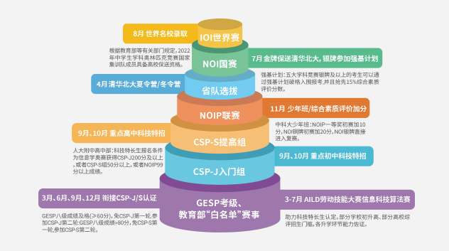 建立科学的选拔和分层教学体系,针对普及组(CSP-J/S)、提高组(NOIP)、省选、国赛(NOI)乃至国际赛(OI)等不同阶段,提供精准、高效的培训方案。